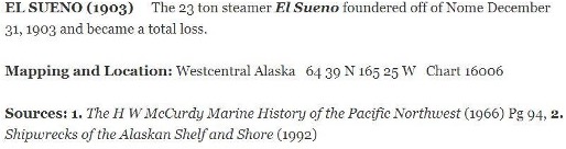 After her salvage and sale El Sueno followed a shadowy career as a freighting and fur trading vessel on the Alaskan coast and across the Bering Sea on Siberia junkets. She was reported wrecked several times but like the preverbal cat continued her service—or continued to be put back in service. One such erroneous citation, from the official list of Alaska Shipwrecks – A Comprehensive Accounting of AlaskaShipwrecks and Losses of life in Alaskan Waters, follows: