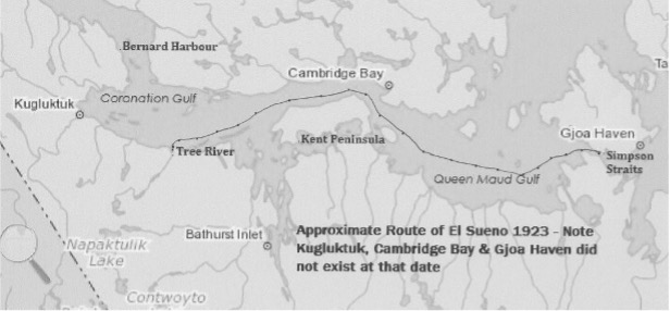 The above photograph and a subsequent one showing El Sueño in winter quarters are from an unpublished work documenting the arctic exploits of William Hoare when he was with an Anglican group attempting to establish a mission station in the Coronation Gulf area from 1914 – 1918. The work also includes his later experiences with the church and when he was a wildlife field worker for the Canadian government in the arctic together with the related arctic experiences of his wife. Their remarkable stories documented by William Hoare’s diaries and photographs are contained in a two-volume document titled Adventures Unlimited by Catherine A. Hoare available from the Archives of the Northwest Territories in Yellowknife, Exhibit N-2013- 022.