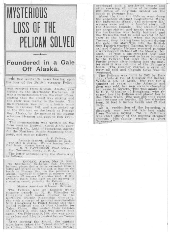 “There can be no longer any doubt regarding the fate of the British steamer Pelican which foundered near the Aleutian Islands, off the coast the coast of Alaska, and her crew, all of whom perished in the disaster.”