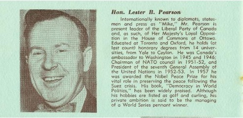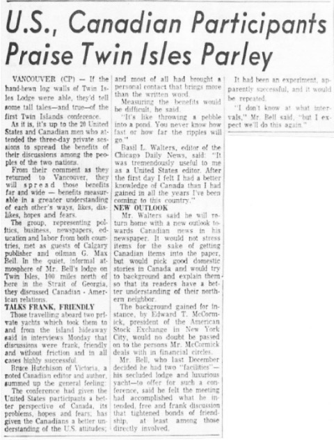 Although Shirley and George were often required to host famous people such as Bing Crosby and Bob Hope who visited while on fishing trips on the Campana, their biggest challenge and accomplishment was hosting the Twin Islands Conference in 1959. This event, which Bell was encouraged to host by Lester Pearson, was hoped to be the start of a series of conferences where prominent Canadians and Americans got together to discuss cross-border subjects in a private relaxed setting emulating the style of the more well-known peace conferences that had been started in 1957 in Pugwash, Nova Scotia, by industrialist Cyrus Eaton. Both the Campana and the Jormholm were used to ferry over twenty invited guests to the three-day event and to supplement the Lodge’s accommodation during the event.